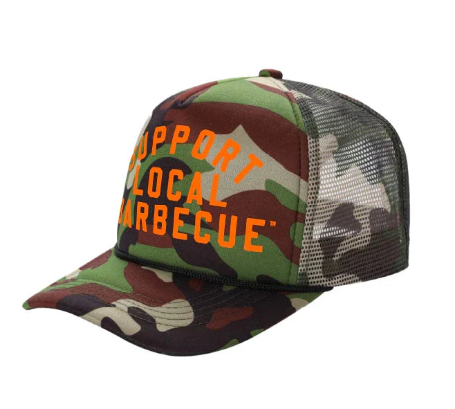 Show your love of barbecue with this Support Local Barbecue™ camo trucker hat emblazoned with hunter orange graphics!